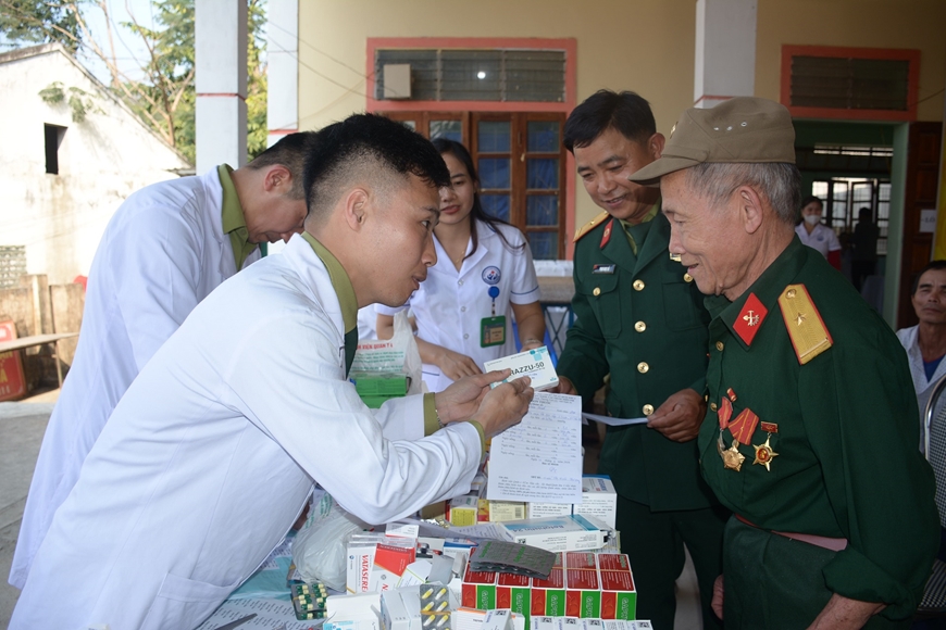 | Thầy thuốc quân y tận tình hướng dẫn người dân cách sử dụng thuốc chữa bệnh. |