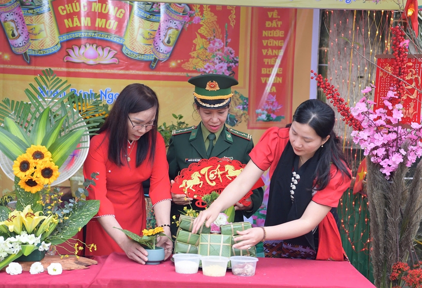 | Bộ đội và nhân dân thi gói bánh chưng. |