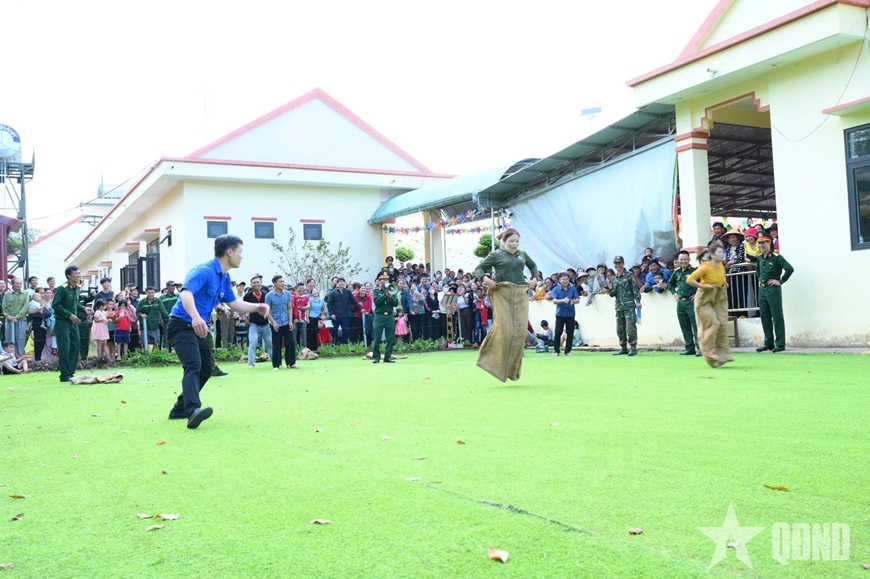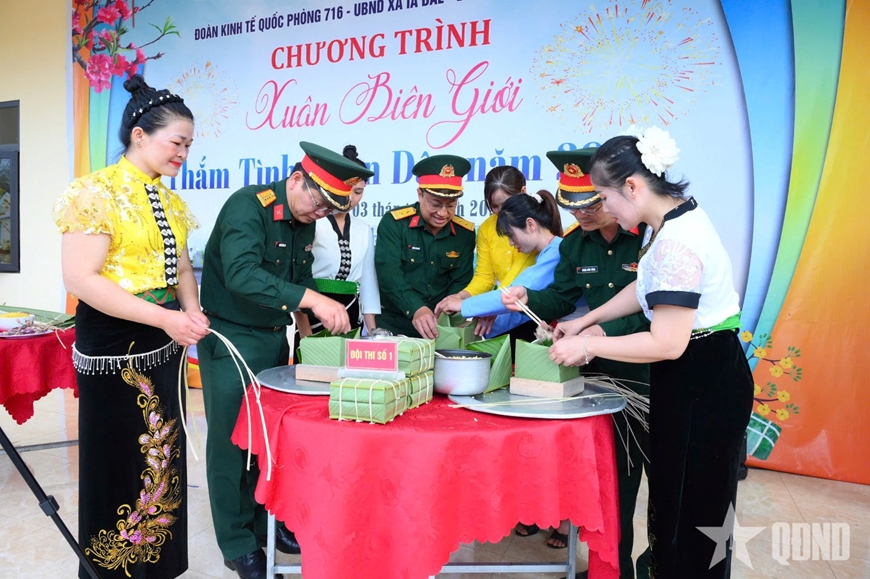 Cán bộ, chiến sĩ, người lao động Đoàn Kinh tế-Quốc phòng 716 cùng nhân dân gói bánh chưng và tham gia các trò chơi dân gian tại chương trình Xuân biên giới thắm tình quân dân năm 2026.