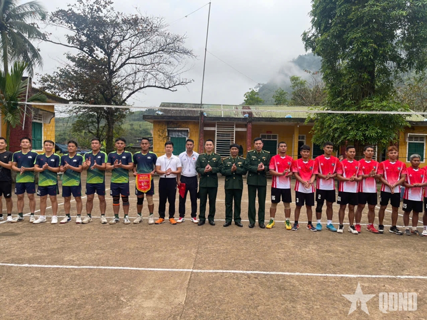 Cán bộ, huấn luyện viên Cụm cơ động chó nghiệp vụ 4 (Trường Trung cấp 24 Biên phòng) giao lưu bóng chuyền với nhân dân địa phương.