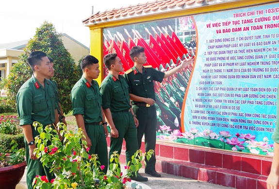Cán bộ, chiến sĩ Trung đoàn 2, Sư đoàn 9 (Quân đoàn 4) tìm hiểu các chỉ thị, nghị quyết được in trên pa nô tại đơn vị. |