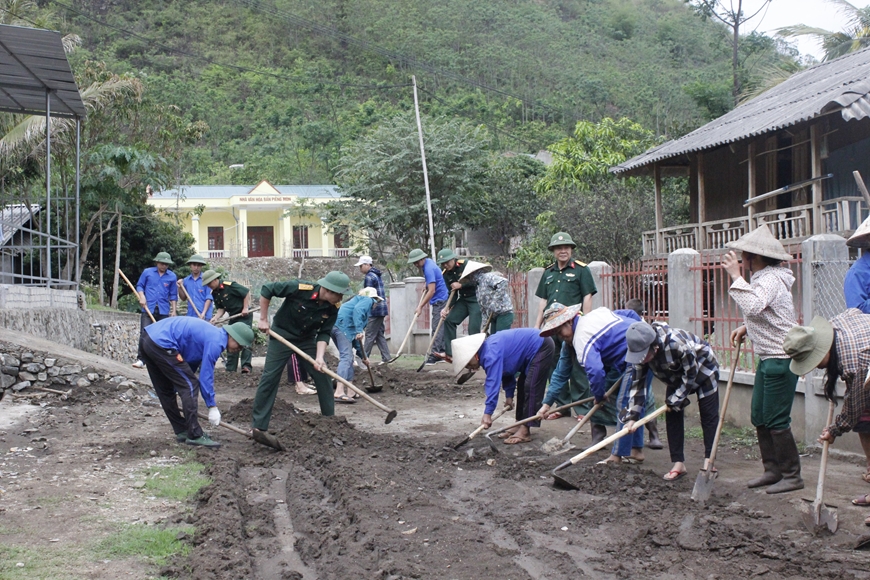 | Bộ đội Đoàn Kinh tế-Quốc phòng 5 cùng nhân dân bản Piềng Mòn (Mường Lát, Thanh Hóa) làm đường giao thông, tháng 9-2020. |