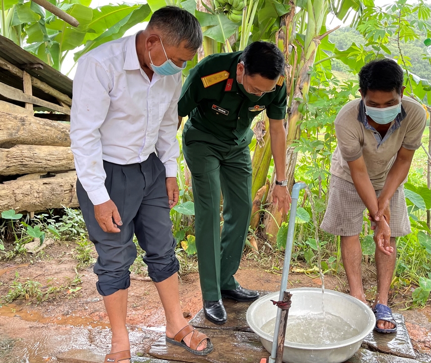 Biết chúng tôi muốn tìm hiểu về công trình nước sinh hoạt được bộ đội thiết kế, lắp đặt cho bà con, vừa vào tới sân, anh Y Tang Buôn Đáp đã dẫn đoàn ra phía sau nhà. Anh mở vòi nước tuôn chảy và khoe: “Nhờ bộ đội mà từ cuối năm 2018 đến nay, gia đình mình và bà con cả buôn không phải lội bộ, leo dốc ra con suối Ea Rang cách nhà gần cây số vất vả gùi nước về nữa. Nước theo đường ống đã tự chảy tới tận nhà. Nhờ có bộ đội, cuộc sống đồng bào M’nông buôn Plúc đã vơi bớt một phần gian khó!”.