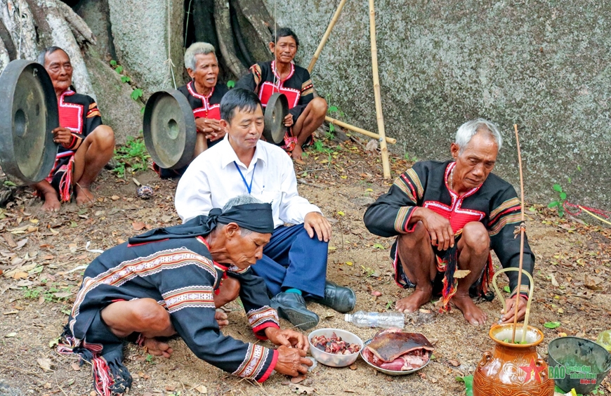 | Ông Rơ Lan Hieo thực hiện nghi lễ cúng cầu mưa trên núi Chư Tao Yang. |