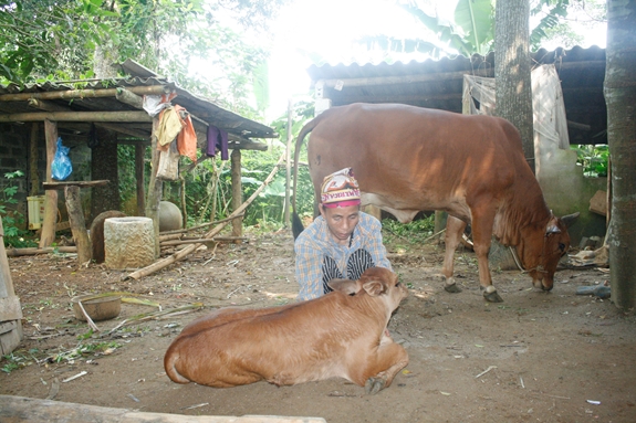 Bà Bùi Thị Tẻm giới thiệu con bê-kết quả từ việc hỗ trợ sản xuất theo nhóm hộ. |