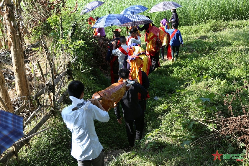 | Một trong những nghi thức quan trọng trong buổi lễ là đi báo cáo với thổ công của làng. |