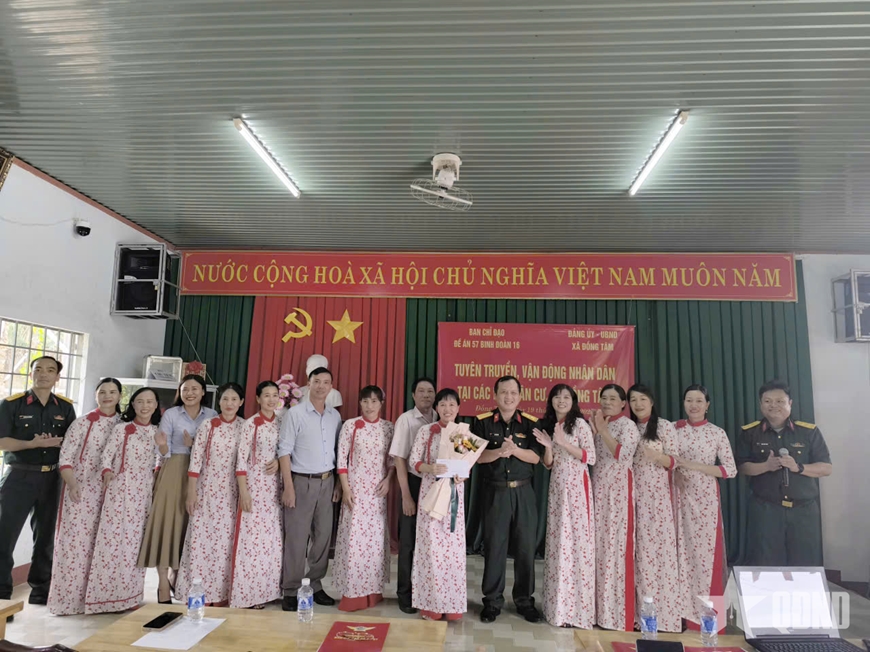 Đại tá Vũ Văn Định, Phó chủ nhiệm Chính trị Binh đoàn 16 tặng hoa và quà cho đội văn nghệ ấp Đồng Tâm 4, xã Đồng Tâm, tỉnh Đồng Nai trong chương trình tuyên truyền Đề án 57 và ngày Đại đoàn kết toàn dân.