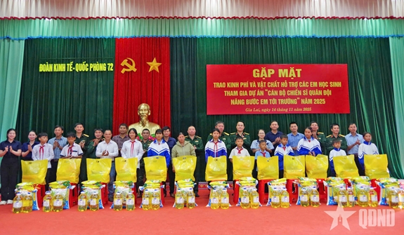 Đoàn Kinh tế - Quốc phòng 72 trao kinh phí, nhu yếu phẩm cho các em học sinh theo Dự án "Cán bộ, chiến sĩ Quân đội nâng bước em tới trường". |