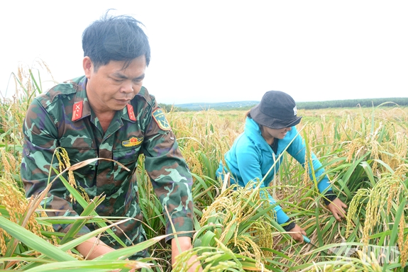 Cán bộ Đoàn Kinh tế - Quốc phòng 72 giúp người dân gặt lúa. |