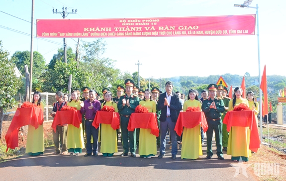 Lãnh đạo Binh đoàn 15, Đoàn Kinh tế - Quốc phòng 72 và địa phương cắt băng khánh thành "Công trình sao sáng buôn làng" tặng nhân dân Nú (xã Ia Nan, tỉnh Gia Lai). |