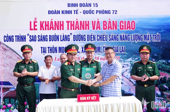 Lãnh đạo Đoàn Kinh tế - Quốc phòng 72 và địa phương ký bàn giao công trình "Công trình sao sáng buôn làng" tặng thôn Mook Trêl (xã Ia Dom, tỉnh Gia Lai). |