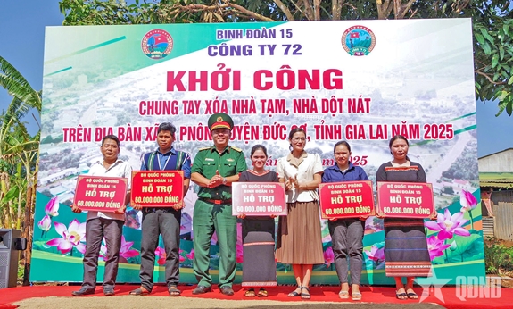 Đại tá Nguyễn Chí Kiên, Bí thư Đảng ủy, Phó đoàn trưởng Đoàn Kinh tế - Quốc phòng 72 trao bảng tượng trưng hỗ trợ kinh phí xóa nhà tạm, nhà dột nát tặng người dân. |