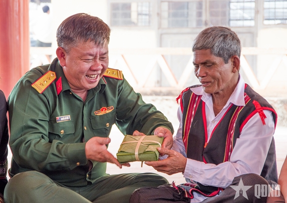 Đại tá Nguyễn Chí Kiên, Bí thư Đảng ủy, Phó đoàn trưởng Đoàn Kinh tế - Quốc phòng 72 (khi mang quân hàm Thượng tá) hướng dẫn đồng bào gói bánh chưng ăn Tết cổ truyền của dân tộc. |
