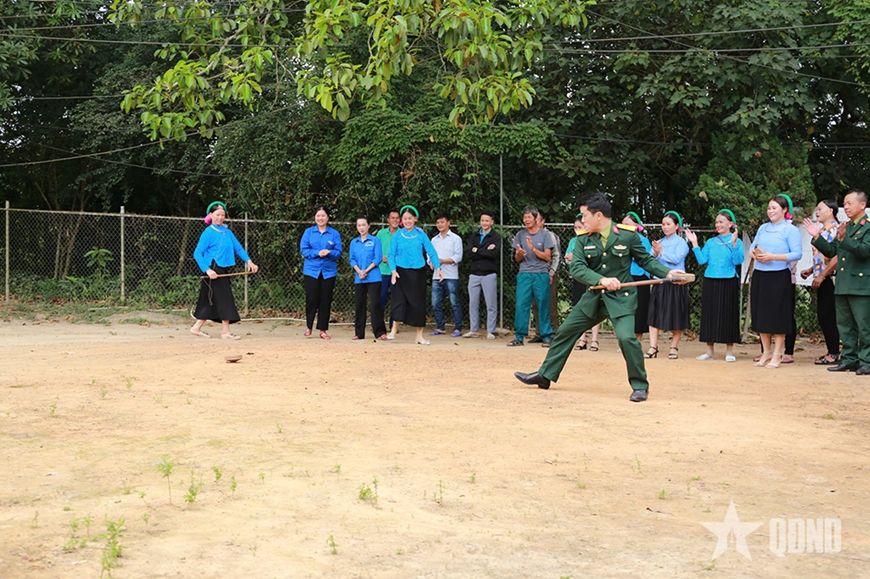 | Cán bộ Lâm trường 156 tham gia trò chơi đánh quay tại thôn Pắc Pộc, xã Hoành Mô, tỉnh Quảng Ninh. |