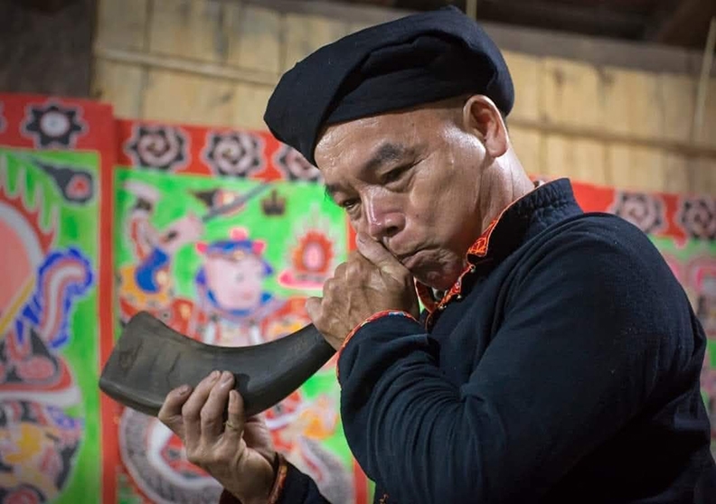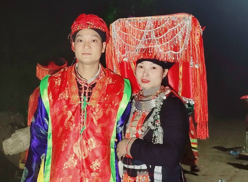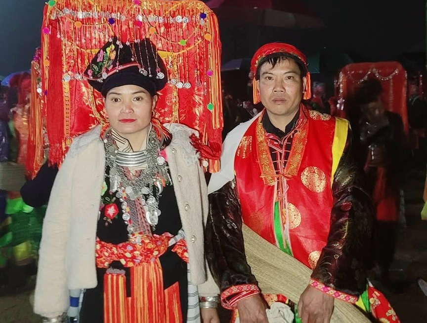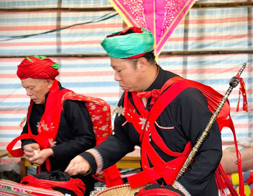 | Đồng bào dân tộc Dao đỏ xã Sơn Lương, tỉnh Lào Cai trong trang phục truyền thống dự lễ, tiệc ngày "kiêng hổ". |