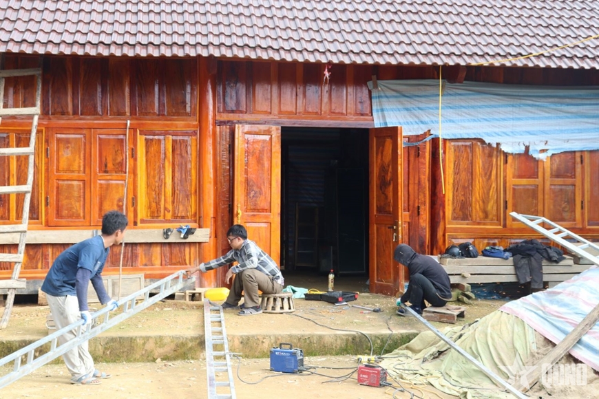 | Người dân ở bản Văng Phao tất bật hoàn thành nhà để kịp đón Tết. |