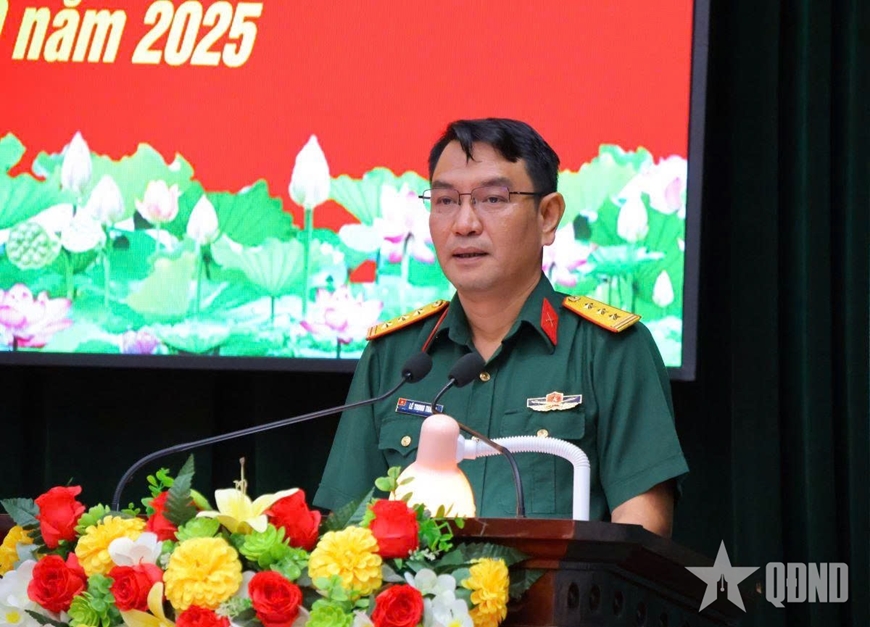 Thượng tá Lê Trung Thành, Giám đốc Công ty TNHH MTV Cà phê 15 phát biểu tại lễ trao con giống tặng hộ nghèo của tỉnh Đắk Lắk.
