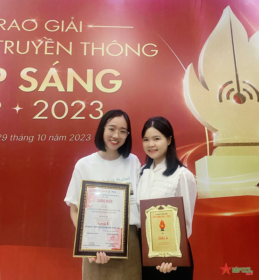 | Tác giả Nguyễn Thị Thảo Ly (bên trái) nhận giải A hạng mục 1: Tác phẩm, sản phẩm báo chí đa nền tảng. |