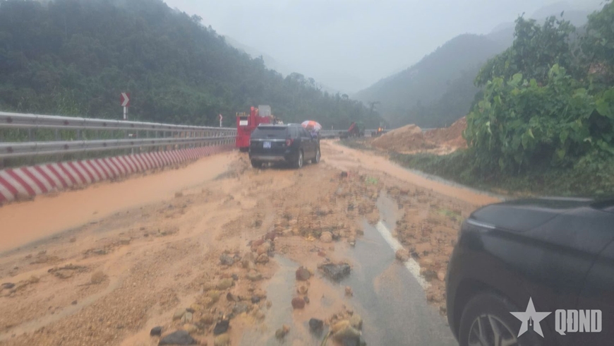 | Hiện trường khu vực đèo Khánh Lê bị sạt lở lúc 8 giờ sáng 17-11. |