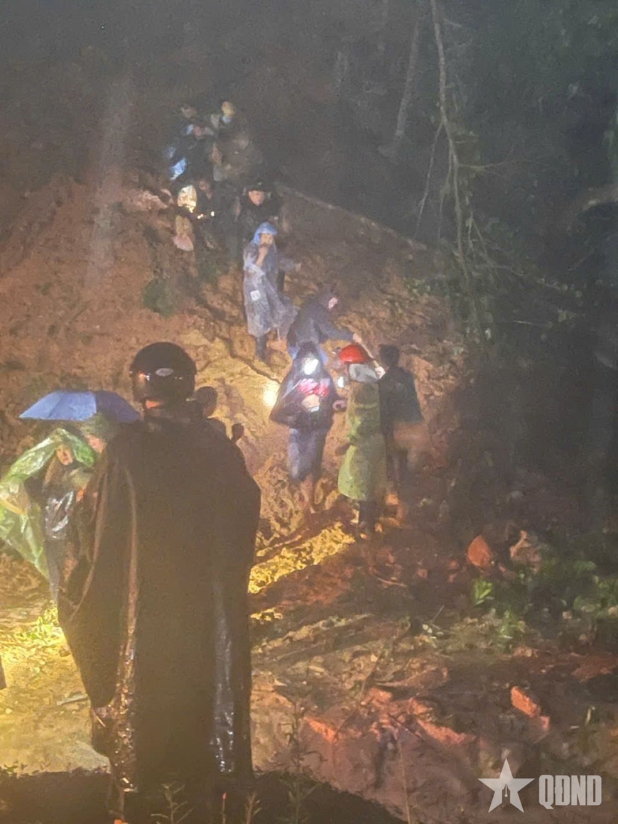 | Lực lượng quân sự, công an và địa phương đưa người dân ra khỏi vị trí bị sạt lở. |