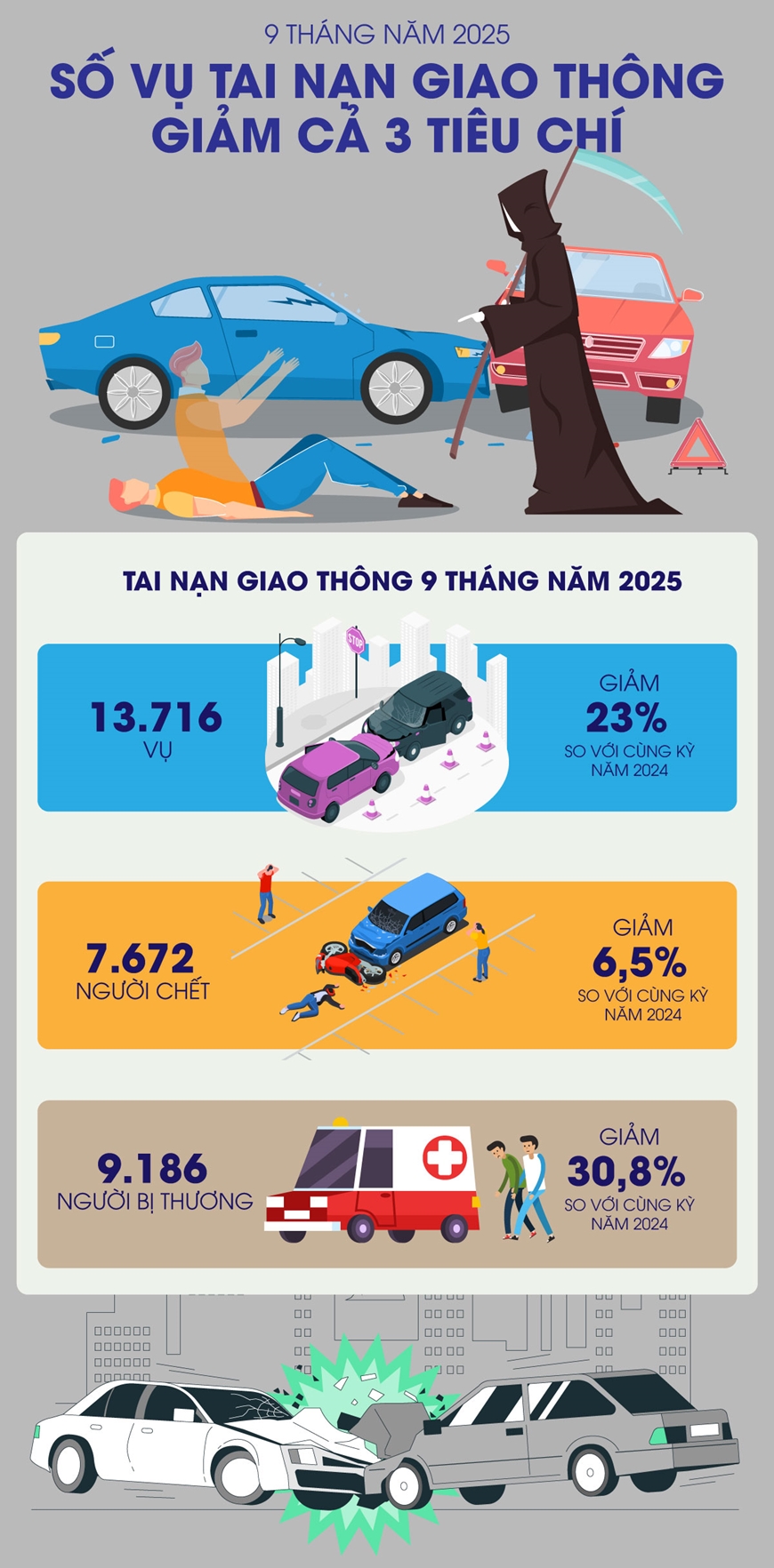 9 tháng năm 2025, cả nước xảy ra 13.716 vụ tai nạn giao thông, làm 7.672 người chết và 9.186 người bị thương. So với cùng kỳ năm trước, số vụ tai nạn giao thông giảm 23%, số người chết giảm 6,5% và số người bị thương giảm 30,8%.