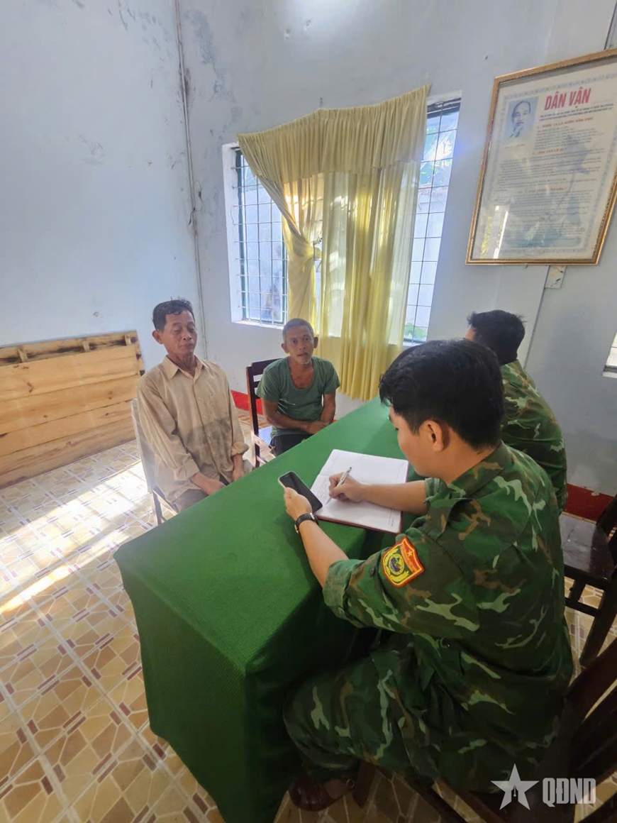 | Lực lượng Bộ đội Biên phòng làm việc với ông Liệt và ông Quang (thuyền viên trên tàu bị cháy). |