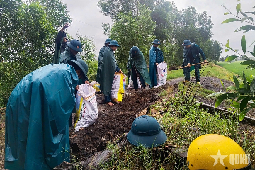 Thông tin từ Ban Chỉ huy Quân sự xã Ô Lâm (Bộ Chỉ huy Quân sự tỉnh An Giang), sáng 29-10, Ban Chỉ huy Quân sự xã đã điều động gần 20 cán bộ, chiến sĩ dân quân phối hợp cùng với các lực lượng tại địa phương gia cố các tuyến đê xung yếu tại tiểu vùng Tây Sà Lôn (ấp Tà Dung).