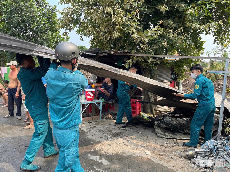 Lực lượng dân quân xã Chợ Mới (tỉnh An Giang) tham gia hỗ trợ người dân bị ảnh hưởng bởi vụ cháy.