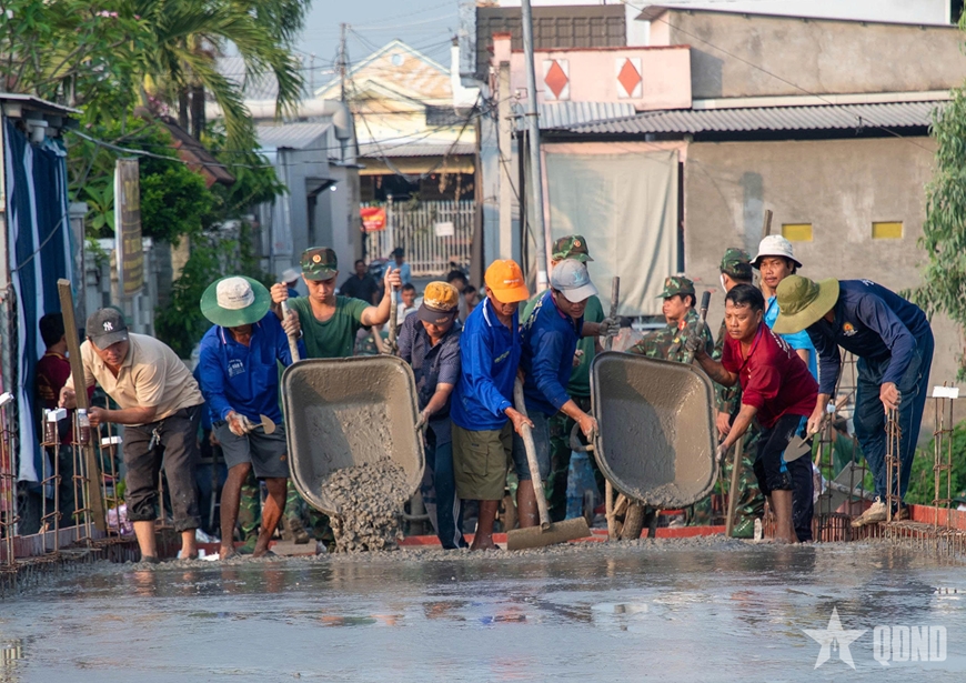Lực lượng vũ trang và người dân xã Mỹ Đức (tỉnh An Giang) hiệp đồng chặt chẽ, bảo đảm tiến độ đổ bê tông cầu Ba Ngạn.