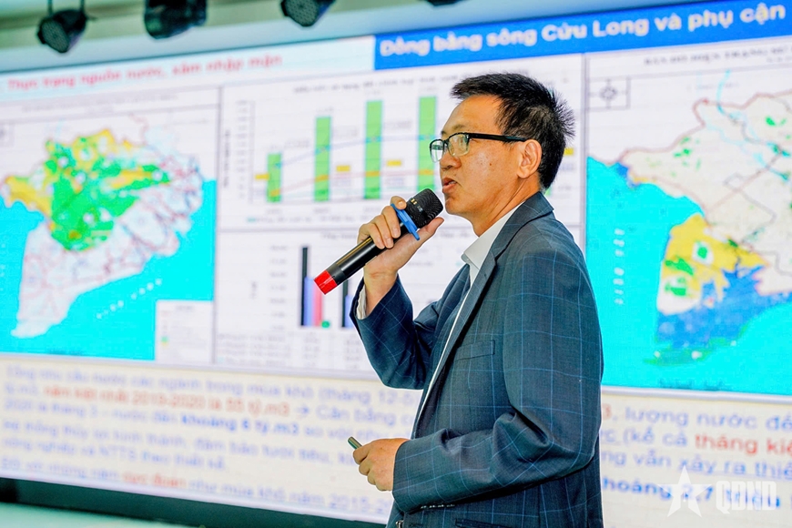 | PGS, TS Nguyễn Phú Quỳnh, Phó viện trưởng Viện Khoa học thủy lợi miền Nam trình bày tại hội thảo. |