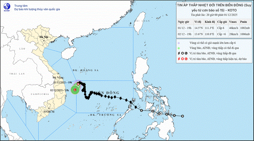 Theo đó, hồi 19 giờ ngày 1-12, vị trí tâm áp thấp nhiệt đới ở vào khoảng 14,5 độ Vĩ Bắc; 111,3 độ Kinh Đông, trên vùng biển phía Tây Bắc khu vực giữa Biển Đông. Sức gió mạnh nhất vùng gần tâm áp thấp nhiệt đới mạnh cấp 6 (50-61 km/giờ), giật cấp 8. Áp thấp nhiệt đới hầu như ít di chuyển.