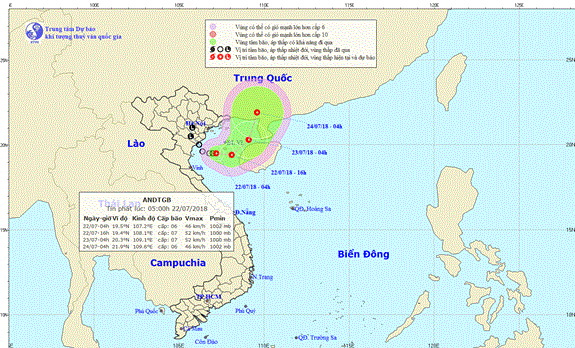 Dự báo trong 24 giờ tới, áp thấp nhiệt đới di chuyển theo hướng Đông Đông Bắc mỗi giờ đi được 5-10km và có khả năng mạnh thêm. Đến 4 giờ ngày 23-7, vị trí tâm áp thấp nhiệt đới ở khoảng 20,3 độ Vĩ Bắc; 109,1 độ Kinh Đông, cách huyện đảo Bạch Long Vĩ khoảng 140km về phía Đông Đông Bắc. Sức gió mạnh nhất vùng gần tâm áp thấp nhiệt đới mạnh cấp 6-7 (40-60km/giờ), giật cấp 8. Phạm vi gió mạnh cấp 6, giật cấp 8 khoảng 60km tính từ tâm áp thấp nhiệt đới.
