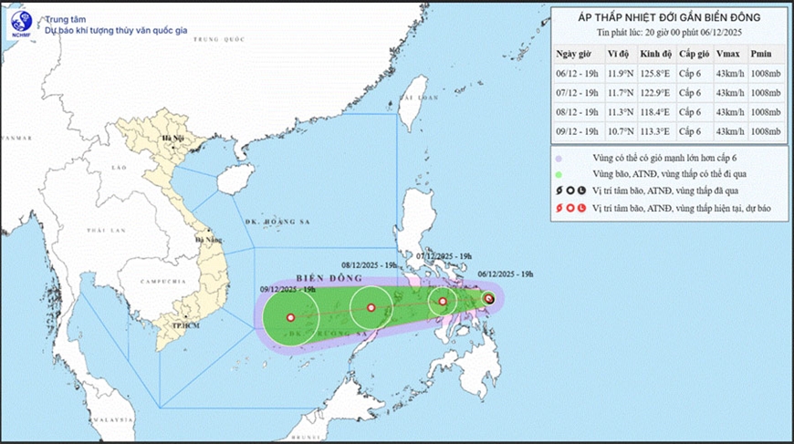 Theo Trung tâm Dự báo khí tượng thủy văn quốc gia, hồi 19 giờ tối 6-12, vị trí tâm áp thấp nhiệt đới ở vào khoảng 11,9 độ Vĩ Bắc; 125,8 độ Kinh Đông, trên vùng ven biển phía Đông của khu vực miền trung Philippines. Sức gió mạnh nhất vùng gần tâm áp thấp nhiệt đới mạnh cấp 6 (39-49km/giờ), giật cấp 8. Di chuyển chậm theo hướng Tây, tốc độ khoảng 5km/giờ. Dự kiến, ngày 8-12, áp thấp nhiệt đới sẽ di chuyển vào Biển Đông.