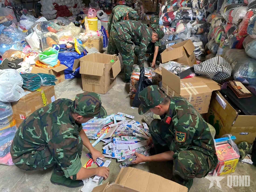 | Cán bộ, chiến sĩ phân loại, đóng gói hàng hóa hỗ trợ. |