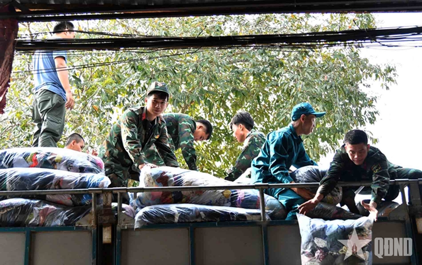 | Cán bộ, chiến sĩ bốc xếp hàng hóa lên xe ô tô. |