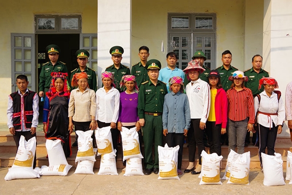 Bộ Chỉ huy BĐBP tỉnh Điện Biên hỗ trợ 65 hộ gia đình mỗi hộ 20kg gạo tại buổi giao nhận nhà. |