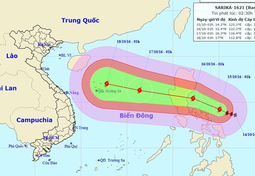 Trung tâm dự báo Khí tượng Thủy văn Trung ương cho biết: Hồi 13 giờ ngày 15-10, vị trí tâm bão có tên quốc tế Sarika ở vào khoảng 14,7 độ Vĩ Bắc; 123,9 độ Kinh Đông, cách đảo Lu Dông (Philippin) khoảng 280km về phía Đông Nam. Sức gió mạnh nhất ở vùng gần tâm bão mạnh cấp 13 (135-150km/giờ), giật cấp 16-17.