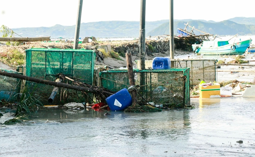 | Lồng nuôi tôm hùm ở phường sông Cầu, tỉnh Đắk Lắk bị sóng do bão số 13 làm hư hỏng. Ảnh: Báo Nông nghiệp và Môi trường |