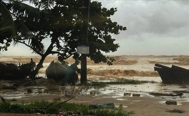 Thủy triều dâng cao, ngư dân tiếp tục chằng dây gia cố thêm thuyền để trên bờ biển. |