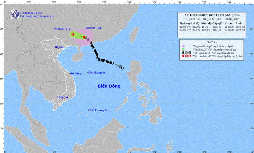 Hồi 19 giờ ngày 8-9, vị trí tâm áp thấp nhiệt đới ở vào khoảng 23,3 độ Vĩ Bắc; 111,0 độ Kinh Đông, trên đất liền phía Tây Nam tỉnh Quảng Đông (Trung Quốc).