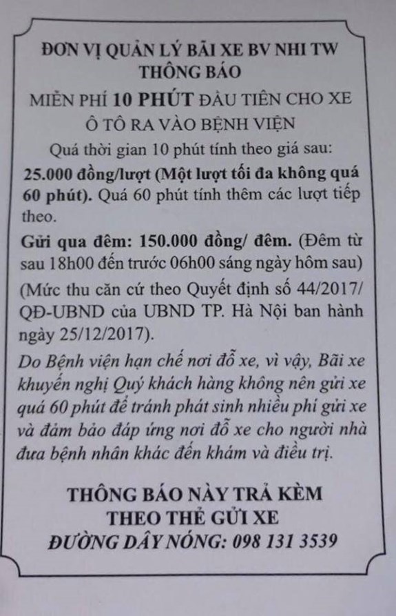 Chia sẻ với chúng tôi về vấn đề này, đại diện Bệnh viện Nhi Trung ương cho biết, hiện đơn vị đã nắm được thông tin về vụ việc trên và thông tin giá vé xe thu của bảo vệ là đúng theo Quyết định 44/2017/QĐ-UBND của UBND TP Hà Nội ban hành ngày 25-12/-2017. Cụ thể với loại xe dưới 2 tấn, xe 9 chỗ ngồi là 25.000 đồng/ lượt/60 phút, nếu quá 60 phút thì tính sang lượt khác. Các xe ô tô khi ra vào Bệnh viện Nhi Trung ương đều nhận được thẻ có ghi thông tin cụ thể về việc xe vào dưới 10 phút được miễn phí, xe vào quá 10 phút được tính theo block 60 phút là 25 nghìn đồng. Nếu người nhà bệnh nhân để xe ô tô qua đêm thì tính phí 150.000 đồng/đêm (đêm tính từ 18 giờ hôm trước tới 6 giờ hôm sau). Khi xe ra cổng, lái xe gửi lại vé thẻ và thông báo, máy tính sẽ in phiếu thanh toán ghi rõ thời gian xe ra vào. “Với trường hợp này, có thể người nhà bệnh nhân đưa con vào khám bệnh lo lắng nên không đọc vé gửi xe cũng như thông tin về giá vé, block tính giá và phí gửi qua đêm tại bệnh viện. Bệnh viện Nhi Trung ương có khuôn viên nhỏ, hạn chế chỗ gửi xe nên chúng tôi đã khuyến cáo trên thẻ xe là quý khách không nên gửi xe quá 60 phút để tránh phát sinh nhiều phí gửi xe và đảm bảo đáp ứng nơi đỗ xe cho người nhà đưa bệnh nhân khác đến khám và điều trị”, Đại diện Bệnh viện Nhi Trung ương nhấn mạnh.