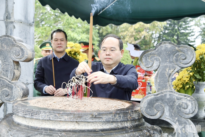 | Đồng chí Quản Minh Cường, Bí thư Tỉnh ủy, Trưởng đoàn ĐBQH tỉnh dâng hương tưởng niệm các anh hùng liệt sĩ tại Khu di tích lịch sử quốc gia Pò Hèn. |