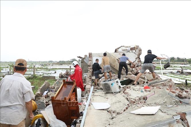 Một căn nhà tại thôn Thượng Đông, xã Yên Khánh, tỉnh Ninh Bình bị đổ sập hoàn toàn do dông lốc. Ảnh: TTXVN |