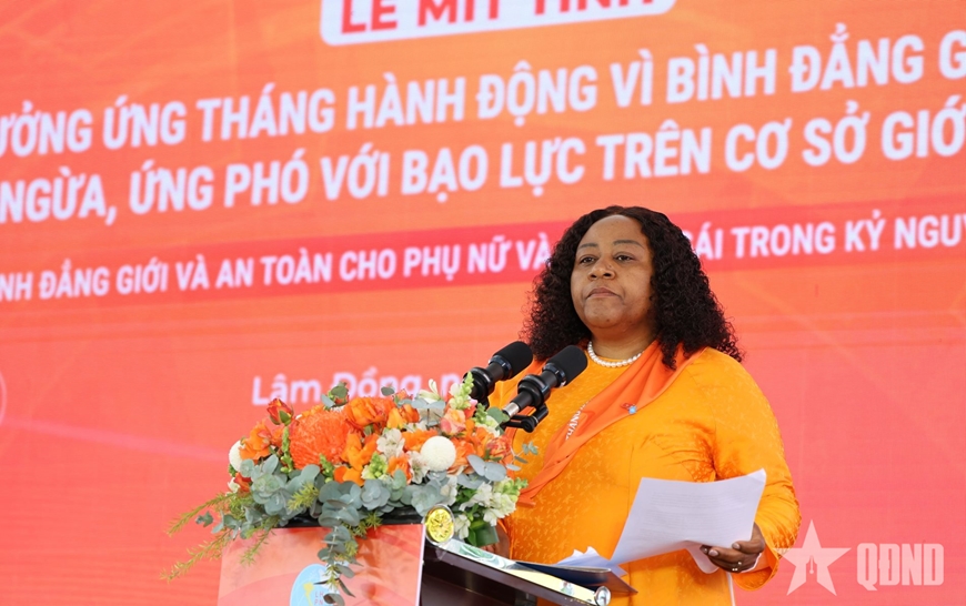| Bà Caroline Nyamayemombe, Trưởng đại diện UN Women tại Việt Nam phát biểu tại lễ mít tinh. |