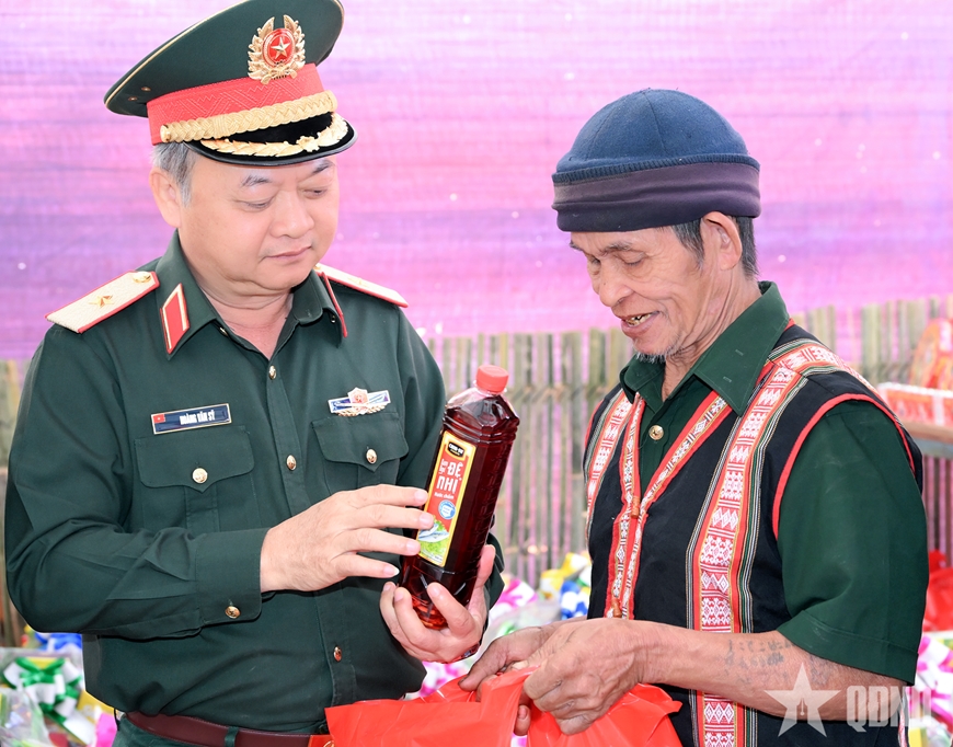 | Đại tá Trần Ngọc Hải, Phó tư lệnh kiêm Tham mưu trưởng Binh đoàn 15 và lãnh đạo Đoàn Kinh tế - Quốc phòng 74 trao bánh chưng tặng già làng. |