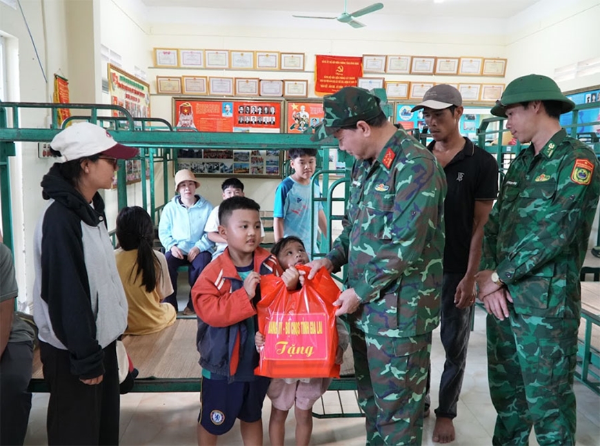 Không chỉ cấp nước, lực lượng quân đội còn kịp thời hỗ trợ người dân bị thiệt hại nặng do bão. Tại Đồn Biên phòng Cát Khánh, thực hiện chỉ đạo của Bí thư Tỉnh ủy Thái Đại Ngọc, Bộ CHQS tỉnh chỉ đạo Đồn Biên Phòng Cát Khách tổ chức nơi ăn, ở cho 24 hộ dân sinh sống tại làng chài ven biển cuối thôn An Quang Đông (xã Đề Gi, tỉnh Gia Lai) bị nhà đổ sập, nứt tường, tốc mái, tài sản bị sóng cuốn trôi do bão số 13 gây ra.