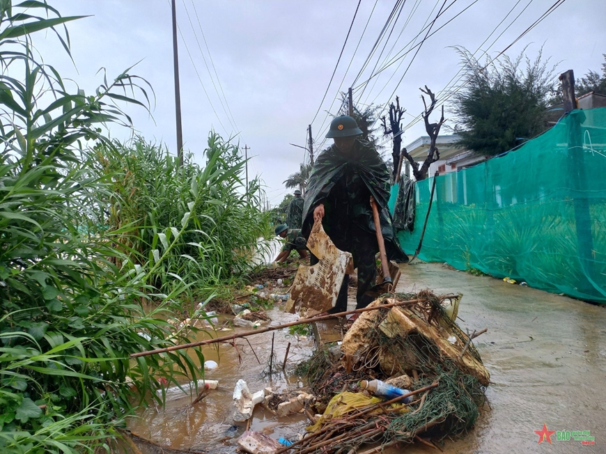 Cán bộ, chiến sĩ Ban CHQS huyện đảo Lý Sơn giúp nhân dân thu dọn rác, khơi thông dòng chảy.
