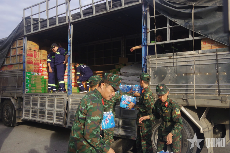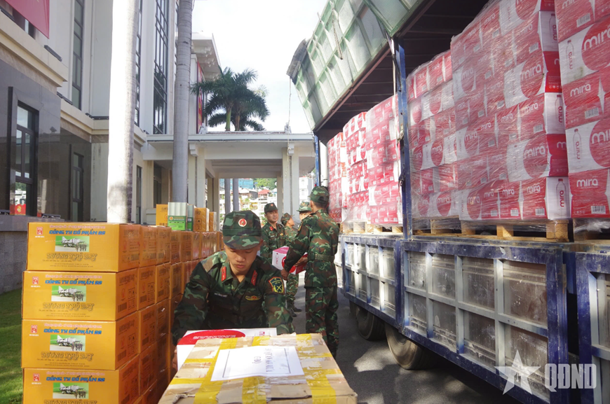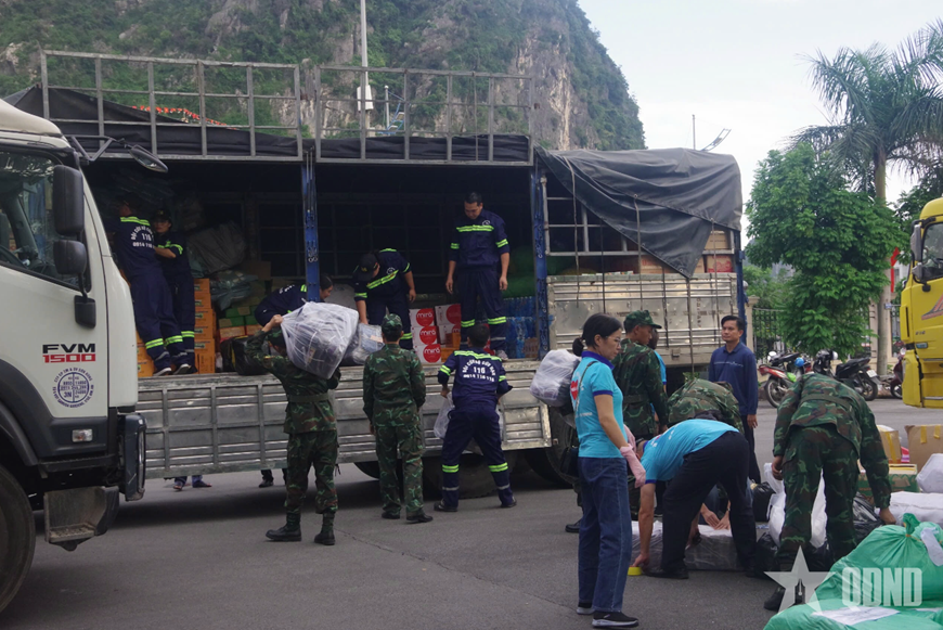 Cán bộ, chiến sĩ Bộ CHQS tỉnh Quảng Ninh cùng các lực lượng khác bốc xếp hơn 40 tấn hàng hóa tập kết tại Trụ sở Ủy ban Mặt trận Tổ quốc Việt Nam tỉnh Quảng Ninh.