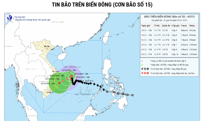 Theo Trung tâm Dự báo khí tượng thủy văn Quốc gia, hồi 19 giờ ngày 29-11, vị trí tâm bão ở vào khoảng 13,5 độ Vĩ Bắc; 112,0 độ Kinh Đông, trên vùng biển phía Tây Bắc khu vực Giữa Biển Đông. Sức gió mạnh nhất vùng gần tâm bão mạnh cấp 9 (75-88 km/giờ), giật cấp 11. Bão hầu như ít dịch chuyển.