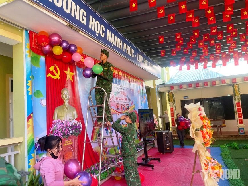 | Bộ đội giúp các trường học trang trí để đón ngày khai giảng. |